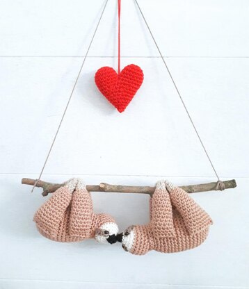 Make your own cute stuffed sloths wall hanging with this easy crochet pattern. It would be a unique gift for the one you love. The two sloths are hanging on a real branch and are kissing under a big red heart. This adorable crochet sloth couple gift can be hung with a nail or pin wherever he/she likes. As you can see in the 8th picture, your couple initials can also be embroidered on the heart, to make this gift even more special.
