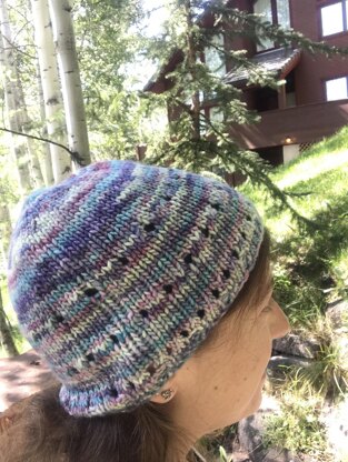 A fun eyelet hat. Light weight and stretchy but not floppy.