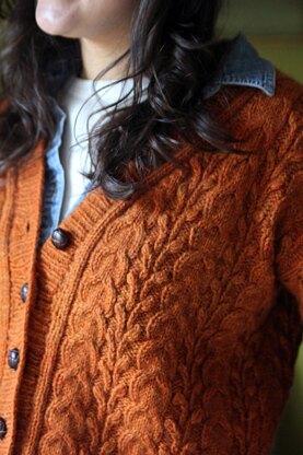 This bottom up cardigan features a striking textured cable and leaf pattern. Worked from the bottom up with generous sleeves and a deep button band and hem, it's a striking wardrobe addition!