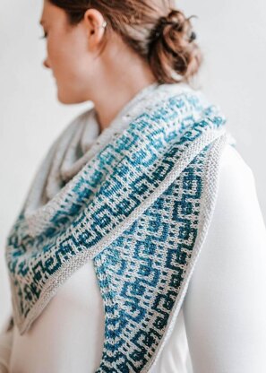 The shawl construction is top-down, triangular and the instructions are both charted and written. Mosaic (slip stitch) is fun and relatively easy as colorwork goes, given that only one color of yarn is used per row. The solid bands are worked in simple garter, lace and texture stitches. The Mosaic sections are perfect for a gradient yarn! Contrasting colors and a smooth yarn are recommended for the Mosaic colorwork to be vibrant and visible.