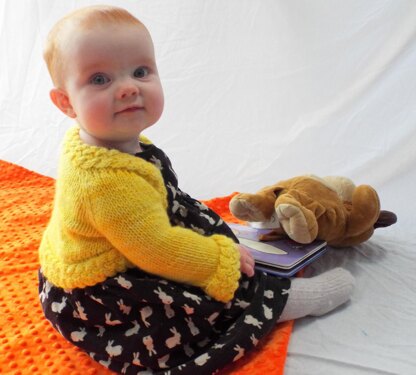 This is a baby bolero worked in aran-weight yarn. The garment is worked in one piece from the top down incorporating the cable along the neckline. It starts with a provisional cast-on, then a short section of the braided cable is worked. Then stitches are picked up along one edge of the cable and from the cast-on edge, allowing the body of the cardigan to grow from there. The cable continues along each edge. The bolero incorporates raglan sleeve shaping, short-row shaping on the body and a knitted-on cable.