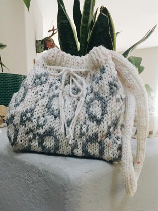 I think you’ll find the construction of the bag to be quite straight forward. The bucket bag is knitted in the round from top-down using a buttonhole technique to create the opening for the straps. The main body is knitted using colorwork. I’ve written the patterns so that you can follow them row by row OR I’ve done a chart that you can easily follow. The bottom of the bag is worked in Garter Stitch and shaped using decrease stitches, and then stitches are grafted together with Kitchener stitch. Later, you’ll knit the strap and drawstring. It was so much fun to make an icord for the strap, but in the PDF, there is an alternative strap if you don't like to knit icords. By the way, if you’ve never tried knitting an i-cord, I think you’ll enjoy it!