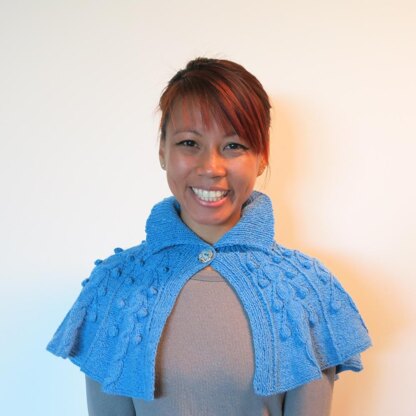 The capelet is knit back and forth, with a 10 sts button band on each edge and 10 (11, 12) repeats of the chart around the body.