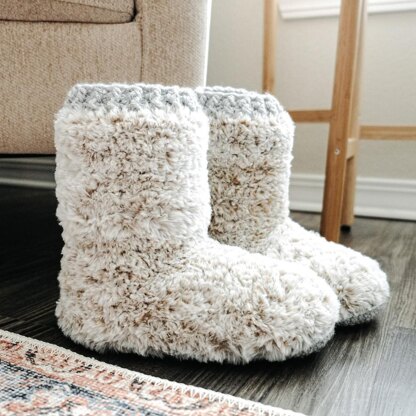 These slippers feature faux fur category 6 super bulky yarn for the ultimate everyday cozy (yet modern) look and feel, but can also be created using a substitute category 6 super bulky yarn of choice. They're perfect for a cool Fall or cold Winter day indoors, and make really great Christmas or Winter Birthday gifts for family and friends.