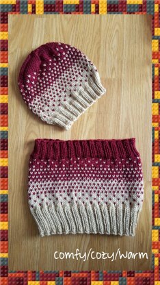 The Snowfall Hat and Cowl is knit in the round and has some simple fair isle colorwork. For me, when there is even basic colorwork it helps the project zip through faster, as it makes for knitting to be a little more interesting.