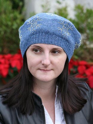 This is a slouchy beret, knitted in the round and worked in one piece from the bottom up. After casting on using a long tail tubular cast on method for 1x1 rib, the brim is worked before commencing onto a beaded section to knit the first snowflake motifs. This is then followed by the crown shaping of the beret which has more beaded snowflake motifs and then an I-cord finish.