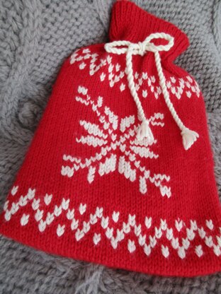 This is a pattern for a Snowflake Hot Water Bottle Cover, originally published in Knitting magazine. It has a fairisle motif and border on the front. It is made in one piece with a seam at the centre back, and finished with a rib, eyelets and tie.
