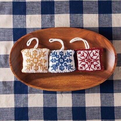 The Snowflake Ornaments are knit flat, with two squares worked in Fair Isle motifs stuffed and sewn together.
