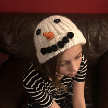A quick-to-knit whimsical snowman cap to brighten the cloudy winter days. This stocking cap is very stretchy to accommodate a wide range of head sizes. The brim is worn folded up. The pompoms are secured in such a way that the snowman’s mood can be changed if desired.