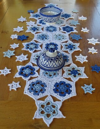 The Snowstorm Table Runner can be made in several sizes from Small which has 19 motifs to Extra-large with 34 motifs, or you could vary it in any way you like. It is made from hexagons and starry snowflakes which fit together. I used 4 shades of blue in the centres and the borders were white. You could choose any colour scheme you like (red and green would be seasonal!).