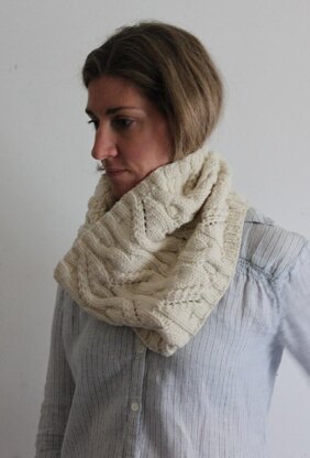 Simple cables and eyelets create a stitch pattern which brings to mind a meandering river through a snowy landscape.