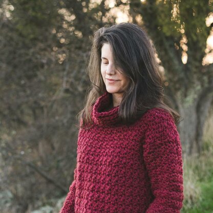 The Snuggle Up Sweater is snuggly and warm, something you could cozy up with in front of the fire with a good book or your favorite show. It’s made with super bulky yarn, so it’s a relatively quick make and very warm. It features a cowl neck, side slits, a longer back, and ribbing along the cuffs and hem.
