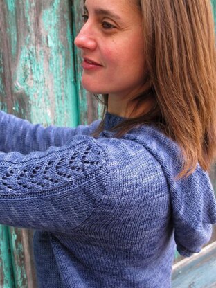 Snuggler is a cozy hoodie with a slight cowl neck worked up in sport weight yarn. Simple lace stripes go up the each arm and border the pocket. There is also a simple rib stitch collar if you don’t want to work the hood!