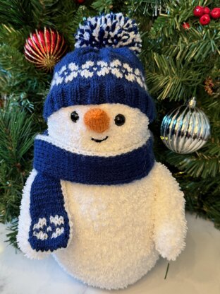 The body, arms, nose, and hat are knit in the round, while the scarf is made using the double knitting technique. The pattern for the hat is done using stranded knitting and there is a chart along with written instructions.