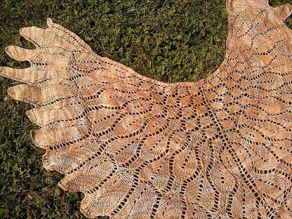 This shawl was inspired by birds' wings, with symmetrical, contoured feathers of differing sizes and shapes. It is not an exact anatomical reproduction of any one species (please do no use this pattern for veterinary purposes, creation of personal flight devices, etc etc) but mirrors the general appearance of the wing structures of flying birds.