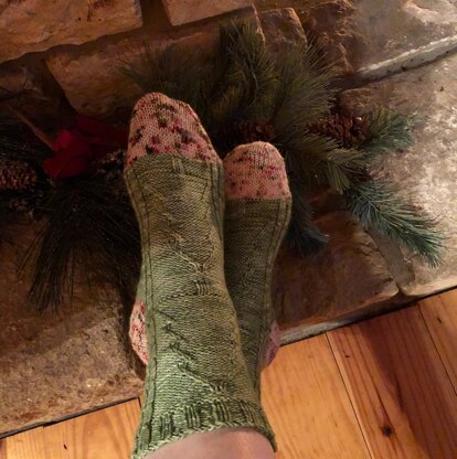 Sockin’ around the Christmas Tree is a Christmas tree sock designed to showcase the beautiful Christmasy Set by Sweet Mountain Crafts. It features cabled Christmas trees on the front panel, and peppermint-twist cables all the way around. The toe and planned afterthought heel use a coordinating mini.
