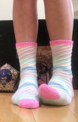 Just like Fizzing Whizbee's you'll be whizzing into summer knitting action with these socks! I was inspired by Universal Studio's rendering of Harry Potter and the HoneyDuke's sweet shop! These are shown here in a size small in knit picks felici reserve in their soft serve colorway. The fun faux cable gives these socks a whimsical active feel, even when you are standing still!
