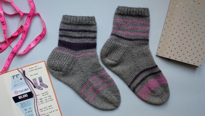 This pattern is written in English in total 6 pages and includes detailed information for knitters who knit socks for the first time!