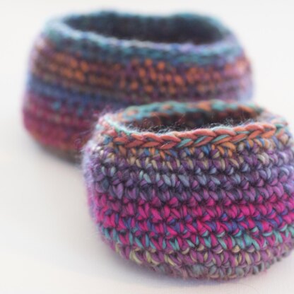 Use up your pretty variegated yarns and make little baskets in any size you want. The baskets in the pictures are 5 inches across by 3 inches high and 4 inches across by 2 1/2 inches high but its very easy to change the size.