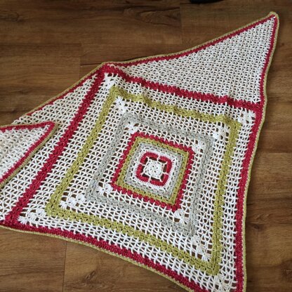 Softly Falling Snow is pretty and quick to make, with a snowflake centre, stripes in festive red and green and a delicate lace pattern suggestive of falling snow. Perfect for the holidays and ideal for gift giving.