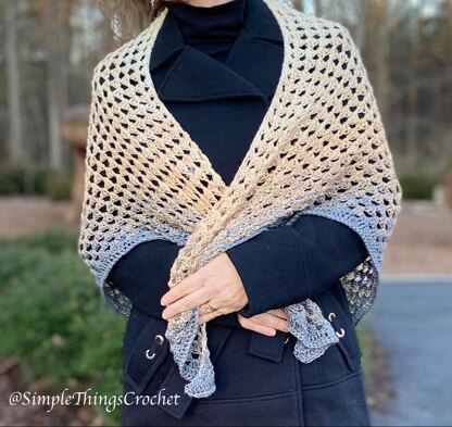 This shawl turned out to be one of my very favorites. It’s light and comfortable, and I love the ombre effect of the yarn. It’s a very easy granny stitch with simple change-up for the edging making it super relaxing to crochet. So enjoy! Dimensions: 32” from top neckline to bottom point, 65” wide from point to point.