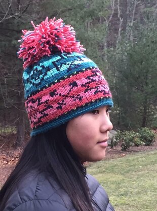 In the ancient Aztec culture, the eagle is the symbol for the sun, hence the name for the hat which translates to “Aztec sun.” The eagle motif is on the teal band. Eagle warriors were the bravest and most feared soldiers. The colors are warm, the motifs are simple. I like it without earflaps, my daughter says “small earflaps with big braids”. So I show it both ways. The pom pom is BIG and takes lots of yarn, but it makes the hat.. Each knitter is the ultimate designer, so choose the colors and finish to please yourself, or to please the person lucky enough to receive your work!