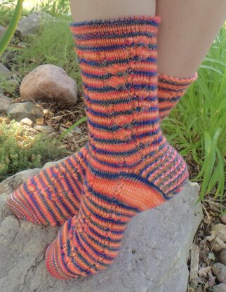 Lacy flames, a pretty picot hem, and an eye-of-partridge heel flap highlight highly variegated yarn.