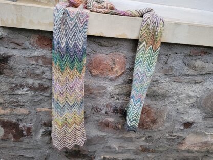 I designed thisfun chevron scarf project to highlight the nonrepeating color changes of the Modernist colorway. When the main colors were more intense, I alternated with the cream color to play up the contrast. When the main colors were softer, I switched to the single-color stitch pattern. The scarf is meant to showcase different-sized sections which look harmonious as a whole. If you're using different yarn, feel free to switch between sections as you wish. For example, use the same plan I did with various different scrap yarns, or alternate at regular intervals to make a graphic scarf using two solid colors. Changing pattern may affect yarn amount needed. I carried the yarn through the striped sections and cut it before each single color section.