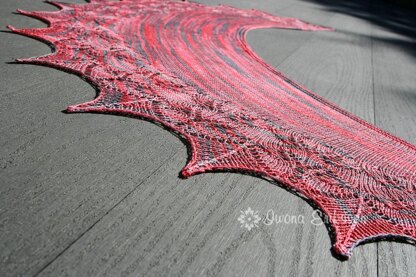 A crescent-shape beautiful shawl with lace border made in silk. But you can knit it in any lace yarn. Worked from down to top. Short rows in stockinette stitch shape the top.
