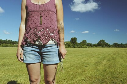 Knitting and crochet join together to create this fun, bohemian-styled, sleeveless top. Soul Sister includes instructions for tank and tunic length options. Knit in pieces and seamed for structure and great fit, this top is worked with eyelet and stockinette sections, a fancy crochet border, i-cord bind offs along the armholes and a picot crochet edging around the neckline. Worked up in Berroco Maya, a blend of cotton and alpaca worsted weight yarn, it is a quick, light-weight summer project!