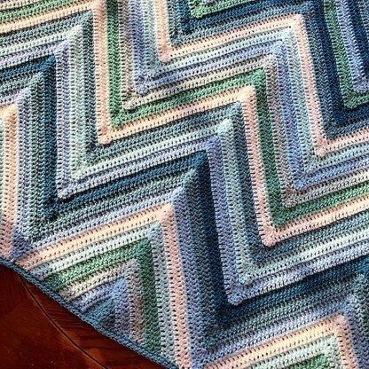 After you work up the Sierra Blanket, it will become your go-to project any time you need a piece made quickly. The clever construction starts with large striped triangles and then the stripes continue in a deep chevron pattern until desired length is reached. Finally, the top edge is squared off, and a simple border is added for the perfect finishing touch. You will simply adore this gorgeous, modern blanket.