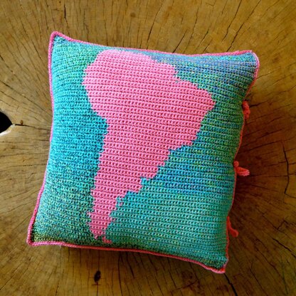 Pillow cover consists of two squares, one with map and one with continent name, both made using single crochet stitch throughout.