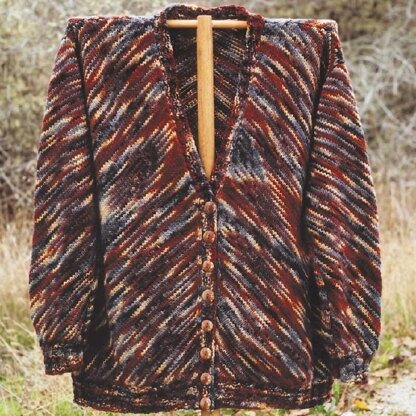V-neck cardigan worked in diagonal stockinette stitch. Button front. Very attractive in any color change yarn.