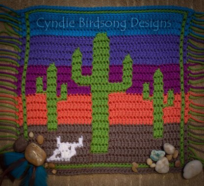 This project takes approx 4 oz of yarn. The background in the sample was done with 5 colors, around .2 oz of each color. The cacti take approx 1.5 oz & the skull can be done with a few yards of scrap yarn. This is a great way to use up scraps!