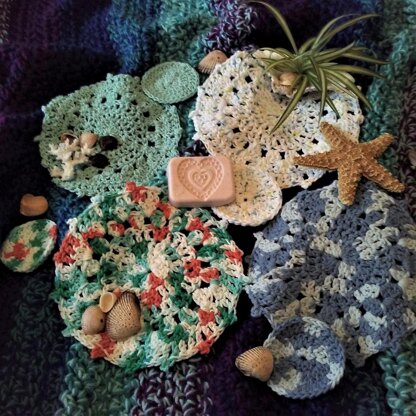 4 sizes included in Circular Scrubbies Crochet Pattern: A larger lacy scrubbie suitable as a dishcloth, washcloth or doily A smaller face scrubbie or coaster with optional hanging loop. A small pad which can be used instead of disposable cotton rounds. 8.5", 4.25", 3.5", 3"