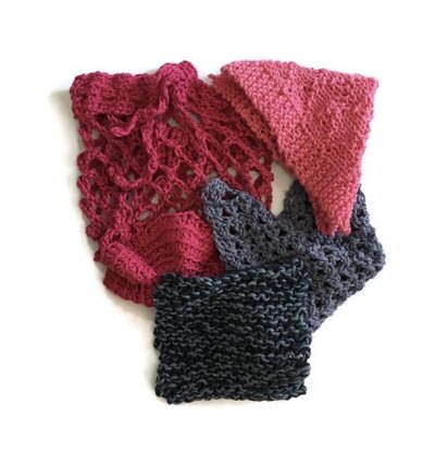 This a a set of a bag, a crochet washer , a knitted washer and a make up remover ( knitted with two strands held double ) . You'll need approximately 200 g of 8 ply cotton to make all four items . Three of the patterns have been published as The Zoë Washcloth , The Lucy Washcloth and Meg's Vege Bags ( which is where you'll see the sizes ) . The make up remover is new .