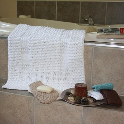 Spa cloths are simple to crochet making them the perfect starter pattern for the beginner. The textured spa mitts are thumbless so they work up fast and easy. The thick and thirsty bath mat also works up quickly holding to strands of cotton, and the classic design will compliment any decor.