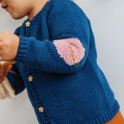 Based on a much loved design from Button and Blue, our brand of knitwear for babies and toddlers, our Space Cardigan is now availiable as a pattern to make your own. Perfect for a little star gazer with playful planet elbow patches and sweet, wooden star buttons.