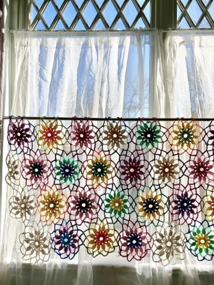 This crochet curtain sparkles in the windows. The sunlight goes through lace motifs but it gives enough privacy from outside. The size is adjustable by number of motifs. These curtain stands out even on small windows. The pattern includes the half shape of motifs for the side.