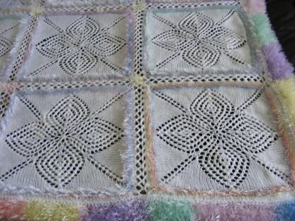 It is made up of 9 lace squares knitted from the centre out and crocheted together, the edging is then knitted.