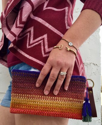 This beginner-friendly and scrap-friendly clutch makes an excellent hook case for your on-the-go project bag. Serape-inspired stripes create a woven gradient look, while a leather or canvas strap, invisible zipper and a double-layered tassel complete this striking boho clutch.