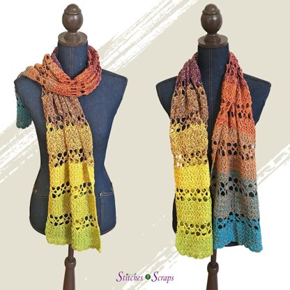 Follow the ancient spice roads across land and sea, to the rich, earthy colors of cinnamon, cardamom, ginger, and turmeric. Indulge your senses in the textures and vibrance of an open-air spice market. Spice Road is an easy, crochet scarf pattern that leads you on a journey through color and texture, accented by airy, lace insets.