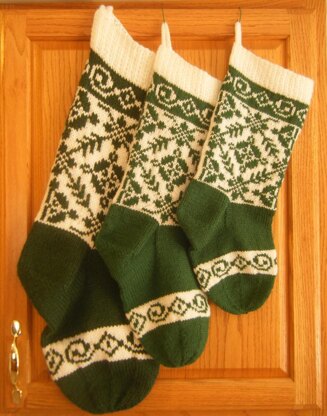 As the result of a trip to Norway, I was inspired by the beautiful designs that were used in the knitting from Selbu, the home of the now famous “Selbu Mittens”. The museum in Selbu has some wonderful pieces of knitting history. This Christmas stocking incorporates a variation of “spider in the bough” with scroll work both at the top of the stocking and the toe. I saw many examples of these borders in the Selbu museum. They were used in hats, mittens, socks and sweaters.