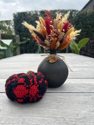 Add a spooky-cute touch to your Halloween décor with this tapestry crochet pumpkin featuring a bold red & black spider design.