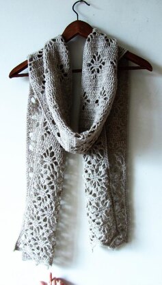 Long scarf with lacy edges. Finished size 24 x 190 cm (9.5" x 75"). Size is easily adjustable. Pattern has written row-by-row instructions and chart.
