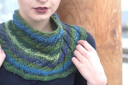 This cowl is light and warm. It is worked from the outside edge to the neck. The raised spiral ridge adds an extra dimension to the fabric. Three options for shaping the neck of the cowl are included.