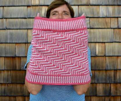 Spiral is a beautiful 2 color slip-stitch op-art cowl that can be worn as a regular cowl or pulled up to become a hood. The technique used to create the fabric, slip-stitch knitting, is a wonderful way to produce beautiful colorwork patterns while still working with only one yarn at a time. The Conic Pattern purposefully varies the location of the slipped stitches in order to produce a combination of vertical, slanted and curved lines. This creates the “optical illusion” reminiscent of the Op-Art movement from the 1960’s.