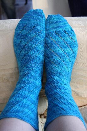 A fun pattern with an easy to remember repeat for the leg. Make the socks matching or make ones that twist in different directions! Worked top down, the pattern is written for double pointed needles but this can easily be made on circulars too. These socks work well with solid and semi sold colors.