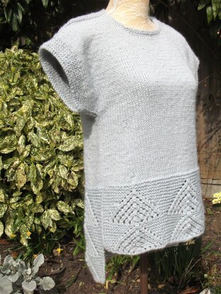 This lovely, easy fit tunic style sweater is all about the pretty, lacy, split level patterned deep hem set against a garter stitch background of the back and front. This design is great for layering and comfortable to wear. The collar is optional.