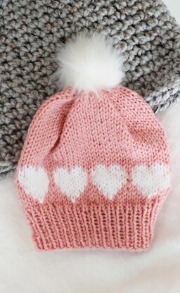 This beginner-friendly knitting pattern creates the cutest little accessory with fair-isle hearts throughout the body of the hat. Written for an average woman's head. If you want to adjust the sizing, cast on fewer or more sts in multiples of 8. Every 8 sts equals 2" in circumference.